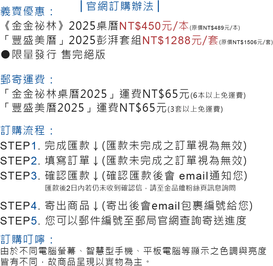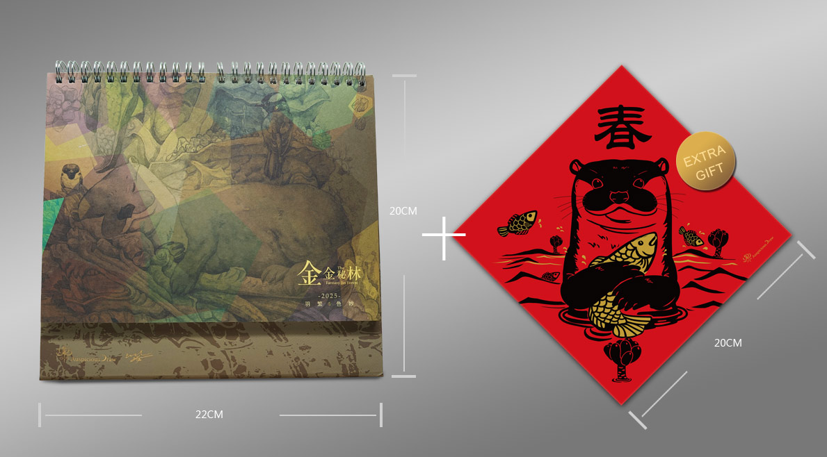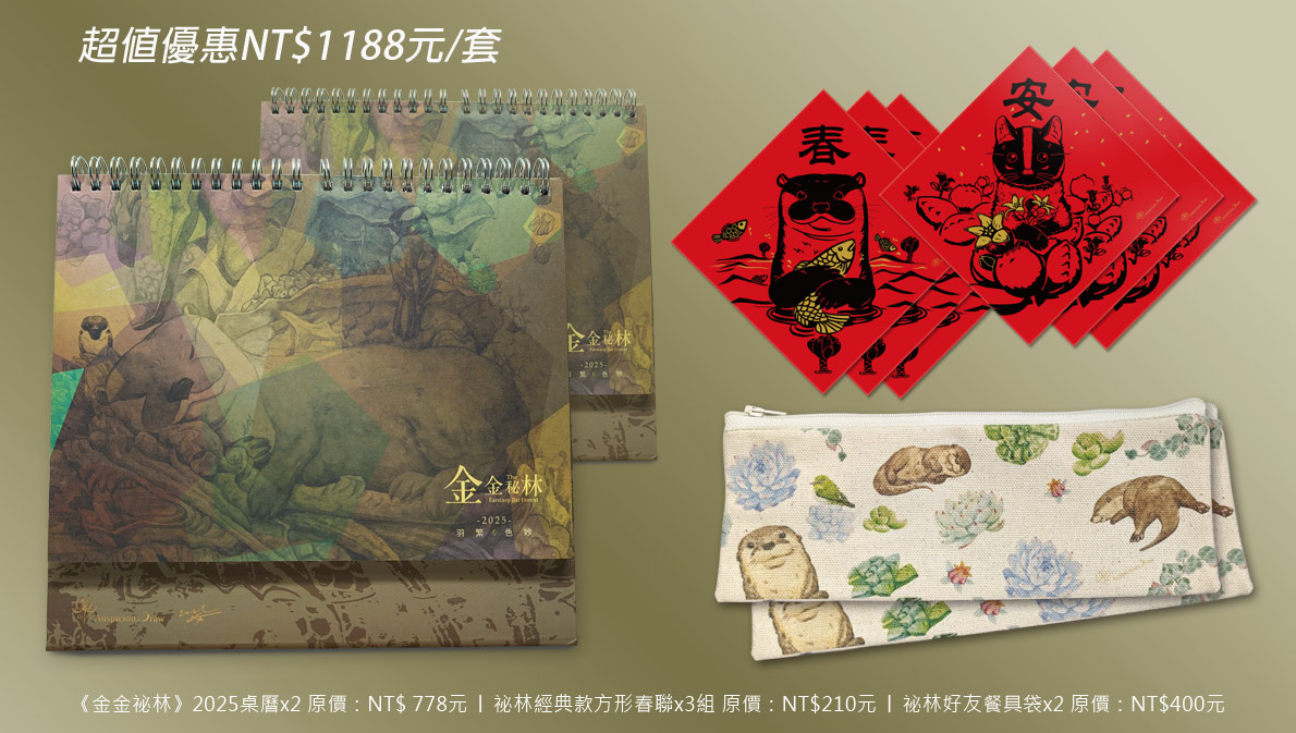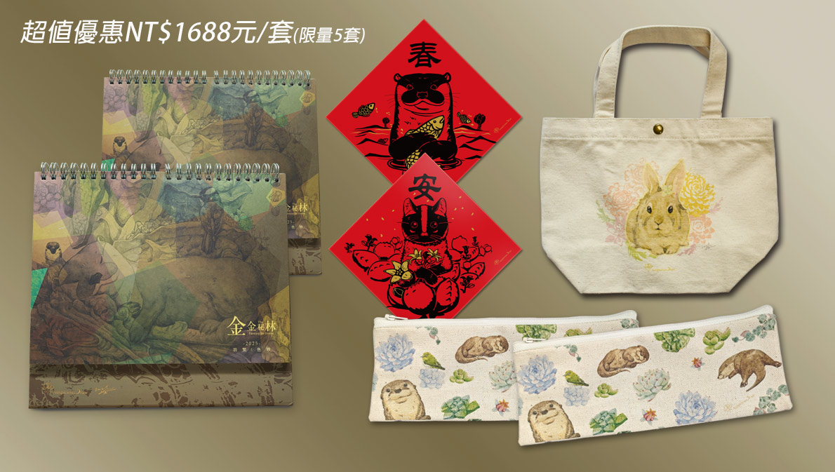 | --金品繪「豐盛美曆」2025豪華套組(限量2套)-- 每套含《金金祕林》2025桌曆x2本 + 祕林經典款方形春聯x3組 + 祕林好友餐具袋x2 + 祕林好納包x1 ....................................................................................................................... 「豐盛美曆」豪華套組-義賣優惠價:NT$1788元/組(訂價:2000/組) 每套捐出售價5%予【野生動物急救站】 |